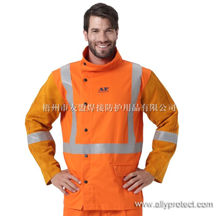 袖由抗火隔熱的牛二層皮制成,衣身由水洗防火阻燃布制成,安全舒涼;